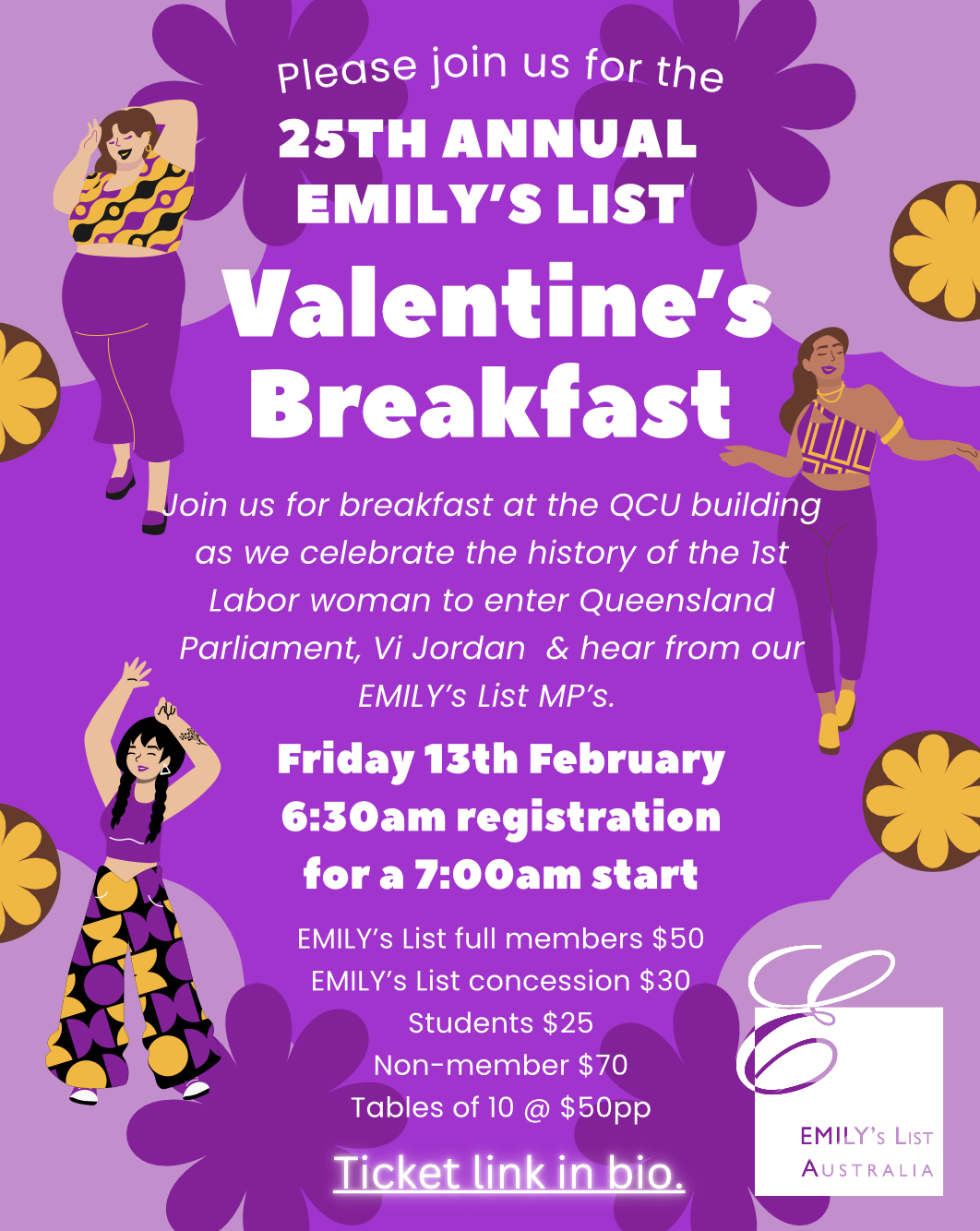 Join us at EMILY's List QLD's 25th Annual Valentine's Day Breakfast on Friday 13th February 2026 at QCU Building, 16 Peel St, South Brisbane!